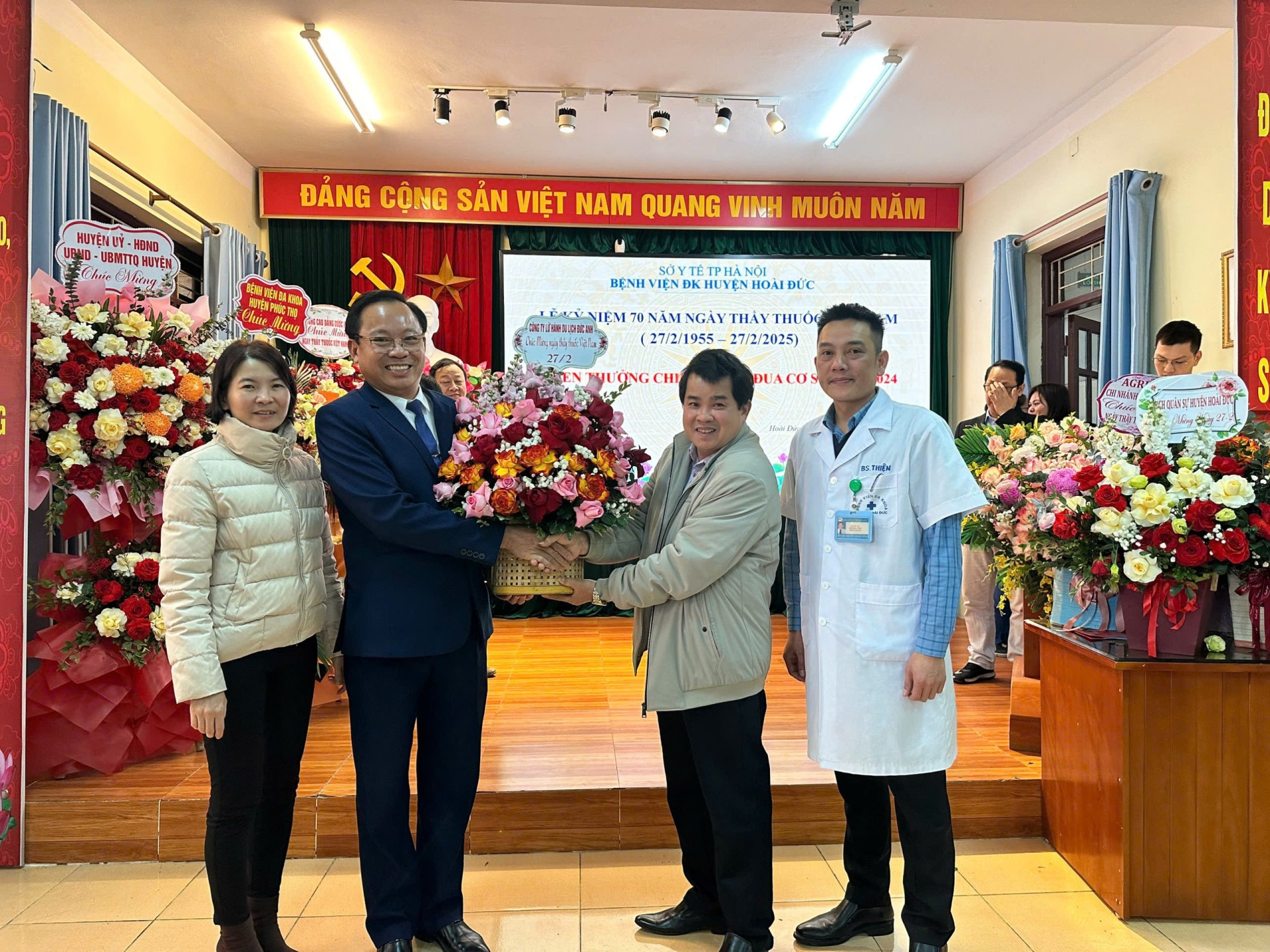 Hòa trong không khí ý nghĩa chào mừng 70 năm ngày Thầy thuốc Việt Nam (27/2/1955 – 27/2/2025), ngày 26/2/2025, Bệnh viện Đa khoa huyện Hoài Đức đã tổ chức lễ kỷ niệm và tuyên dương các tập thể, cá nhân có thành tích xuất sắc. Tại lễ kỷ niệm, bệnh viện đã trao tặng khen thưởng cho tập thể các khoa, phòng và cá nhân có thành tích xuất sắc trong thực hiện nhiệm vụ năm 2024. Đặc biệt, toàn thể cán bộ viên chức người lao động bệnh viện đã phát huy những thành quả đã đạt được, liên tục triển khai các phong trào thi đua sôi nổi để hoàn thành và hoàn thành vượt mức chỉ tiêu kế hoạch đề ra và vinh dự nhận bằng khen, danh hiệu do UBND thành phố Hà Nội và Sở y tế Hà Nội trao tặng. Trong đó, về danh hiệu thi đua: Tập thể Bệnh viện đa khoa huyện Hoài Đức được UBND thành phố Hà Nội trao tặng bằng khen đã có nhiều thành tích trong phong trào thi đua “Ngành Y tế 70 năm làm theo lời Bác Hồ dạy” hướng đến kỷ niệm 70 năm ngày Thầy thuốc Việt Nam (27/2/1955 - 27/2/2025); 04 khoa, phòng được UBND thành phố Hà Nội khen thưởng đạt danh hiệu tập thể lao động xuất sắc; 02 cá nhân được nhận bằng khen của Bộ Y tế. Phát biểu tại buổi lễ, đồng chí Đoàn Thịnh Trường – Giám đốc Bệnh viện Đa khoa huyện Hoài Đức ghi nhận, biểu dương những tập thể, cá nhân đạt thành tích xuất sắc trong phong trào thi đua. Đồng chí nhấn mạnh, đây là minh chứng cho tinh thần đoàn kết, sự nỗ lực không ngừng của đội ngũ y bác sĩ. Đồng thời, đồng chí giám đốc bệnh viện mong muốn các cá nhân, tập thể tiếp tục trau dồi y đức, nâng cao chuyên môn, góp phần nâng cao chất lượng khám chữa bệnh, phục vụ tốt hơn sức khỏe nhân dân. Tập thể bệnh viện đa khoa huyện Hoài Đức đã vinh dự tiếp đón đoàn lãnh đạo huyện Hoài Đức, các đơn vị, đối tác chúc mừng bệnh viện nhân dịp kỷ niệm 70 ngày Thầy thuốc Việt Nam. Những thành tựu đạt được là nguồn động lực to lớn để Bệnh viện Đa khoa huyện Hoài Đức không ngừng phát triển, nâng cao chất lượng khám chữa bệnh, mang đến dịch vụ y tế tốt nhất cho người dân. Nhân kỷ niệm 70 năm Ngày Thầy thuốc Việt Nam, xin gửi lời tri ân sâu sắc đến những người thầy thuốc – những “chiến sĩ áo trắng” luôn tận tâm, cống hiến vì sức khỏe cộng đồng. Chúc các y bác sĩ luôn dồi dào nhiệt huyết, vững vàng y đức và tiếp tục cống hiến hết mình vì sức khỏe cộng đồng. Một số hình ảnh tại hội nghị