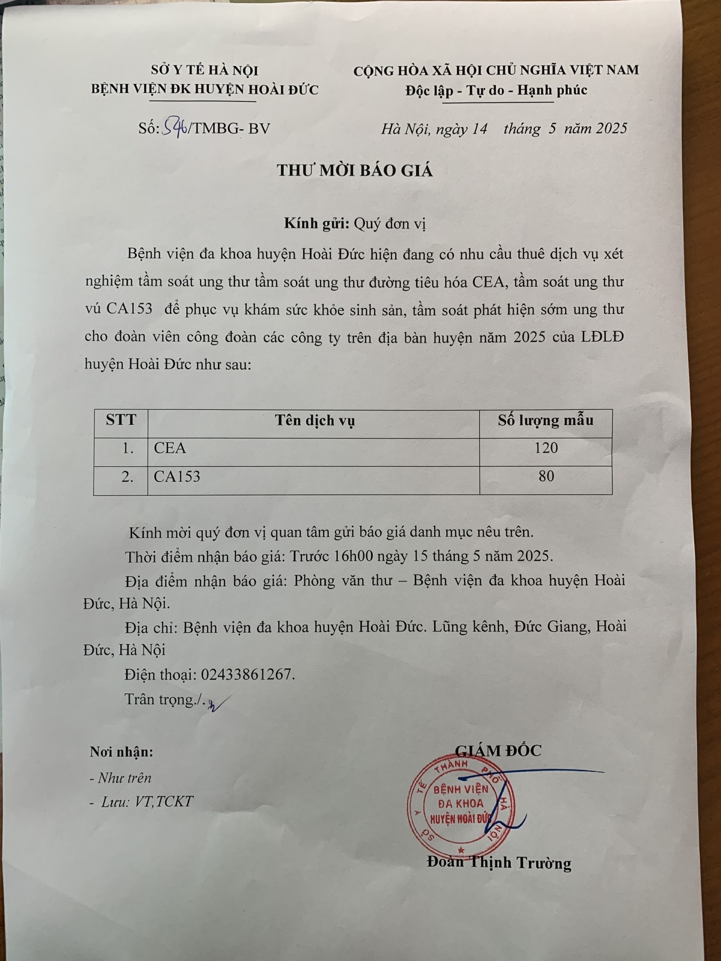 Thư mời báo giá: Gói thầu tầm soát ung thư tại BVĐK huyện Hoài Đức
