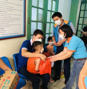 Bà Nguyễn Thị Lan- Trưởng nhóm thiện nguyện Lan Ngọc- Lai Xá phát quà cho các cháu thiếu nhi tại khoa Khám Bệnh.
